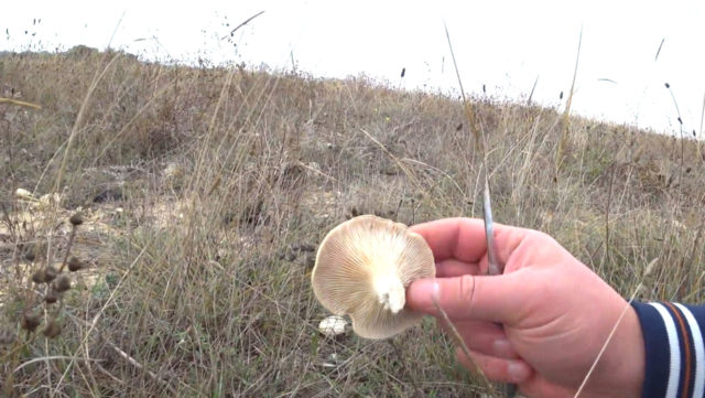 Гриб похож на кособокую воронку с завернутыми краями, пластинки белые, редкие и очень широкие. Но не в этом дело! Уж очень интересно он растет: не на земле и не на деревьях, как все нормальные грибы, а на… траве — на колючем татарнике, например, или на синеголовике полевом».